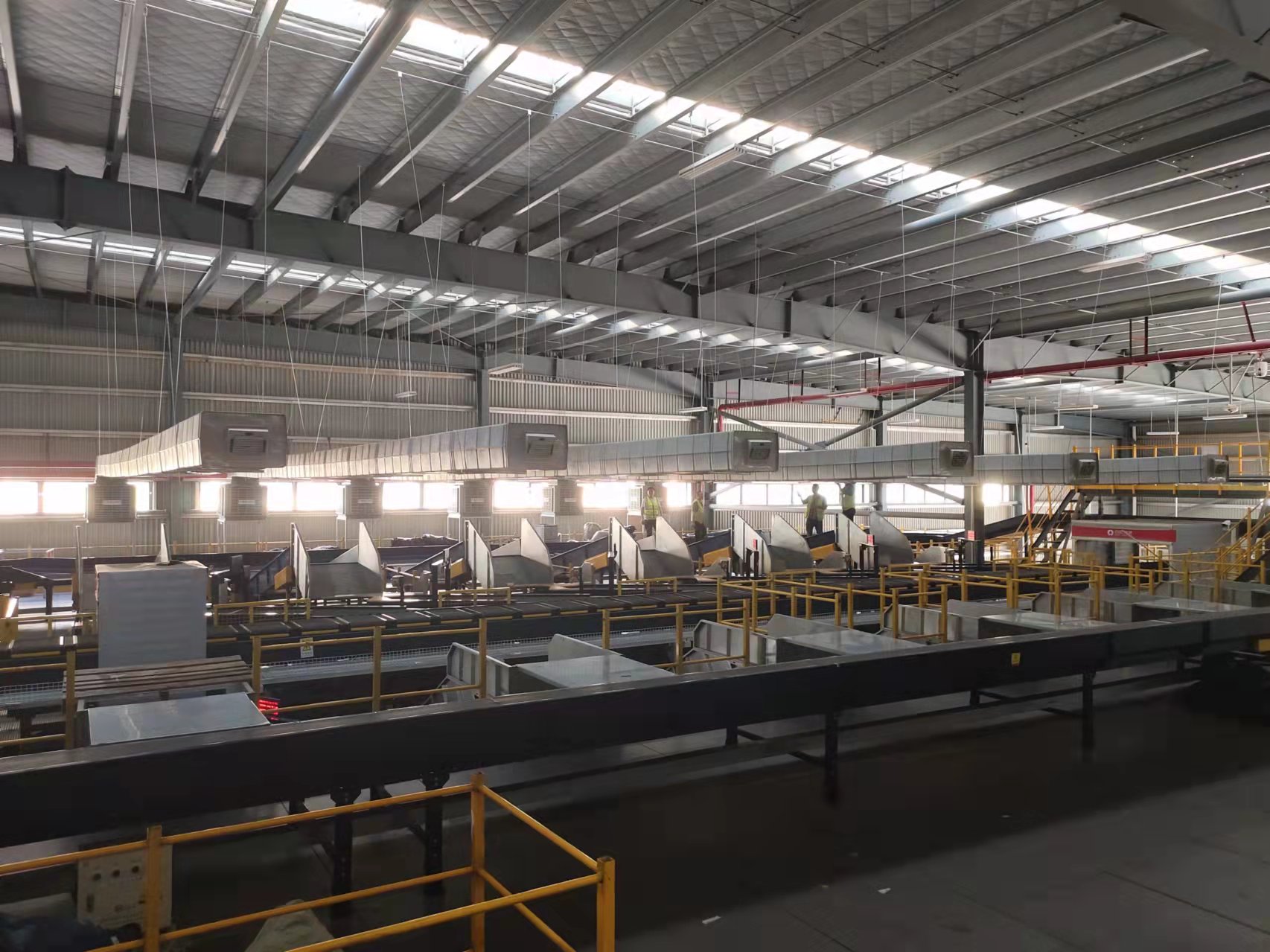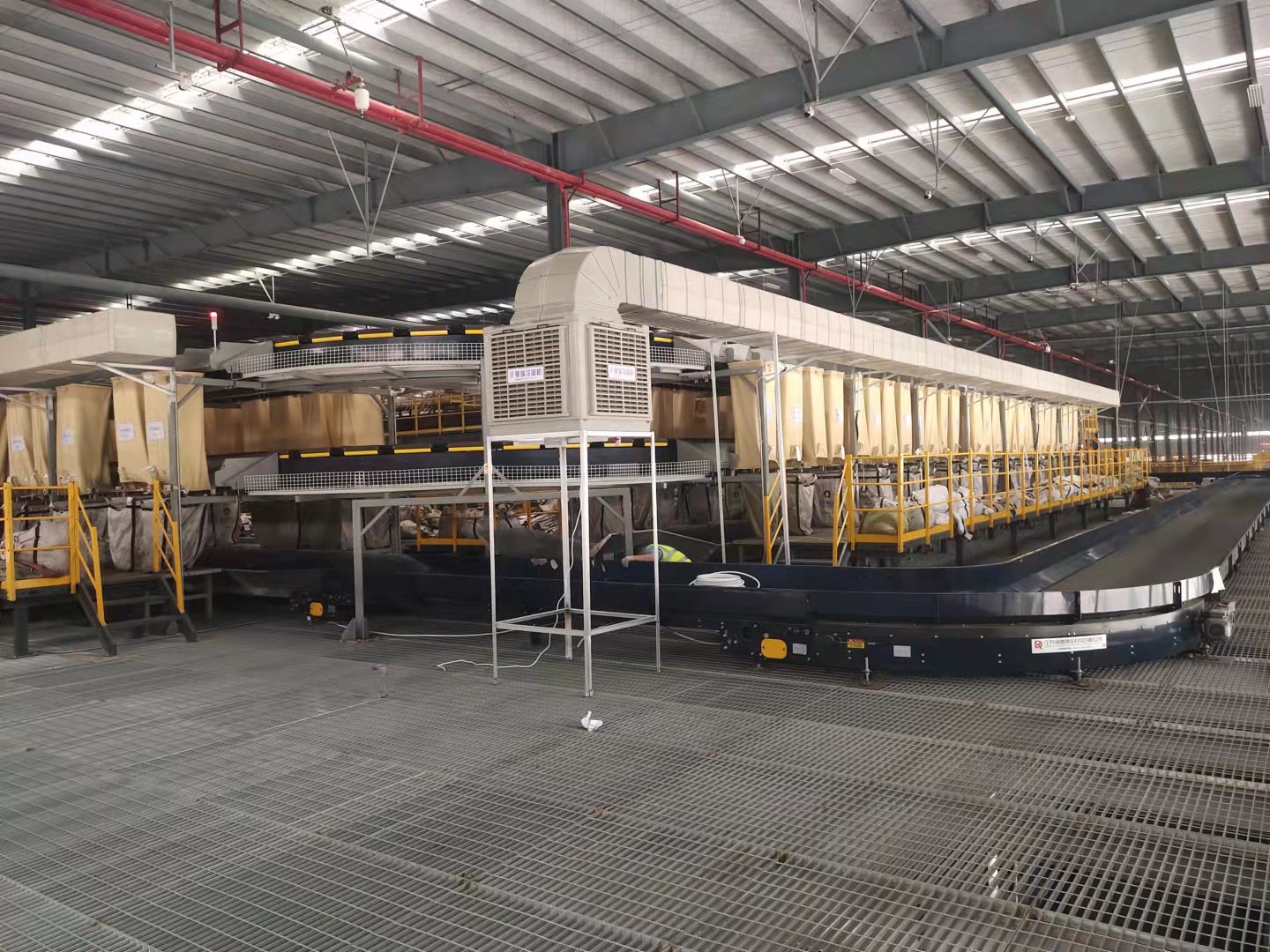 百世集團(tuán)廣州番禺分撥是一家大型物流運(yùn)轉(zhuǎn)中心,場(chǎng)地面積50000平方,倉庫主體是鋼結(jié)構(gòu),廣州夏季溫度高倉儲(chǔ)運(yùn)轉(zhuǎn)設(shè)備發(fā)熱多等特點(diǎn),夏季庫房溫度達(dá)到40度左右,分揀員工無法正常工作,有可能發(fā)生意外和中暑,我公司工程師經(jīng)過現(xiàn)場(chǎng)勘查,設(shè)計(jì)50臺(tái)夏瑞22型冷風(fēng)機(jī),加裝管道采取定點(diǎn)崗位送風(fēng),另外配XR-730型工業(yè)大吊扇,安裝后室內(nèi)溫度達(dá)到30度左右,通過大風(fēng)扇把涼爽空氣送到每個(gè)角路,大大的改善了工作環(huán)境,受到領(lǐng)導(dǎo)和員工一直好評(píng)。